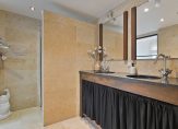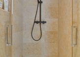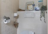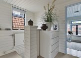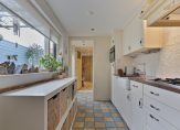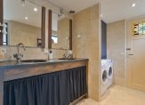 Aansluitend aan de woonkamer is de keuken met recent vernieuwde apparatuur. Daarachter het toilet en een zeer ruime badkamer met grote inloopdouche, verwarmd handdoekrek, wastafelmeubel met dubbele wastafel, vloerverwarming en mechanische ventilatie. Hier bevinden zich -mooi weggewerkt- de cv ketel en de omvormer voor de zonnepanelen. En hier zijn de aansluitingen voor de wasmachine en droger.
