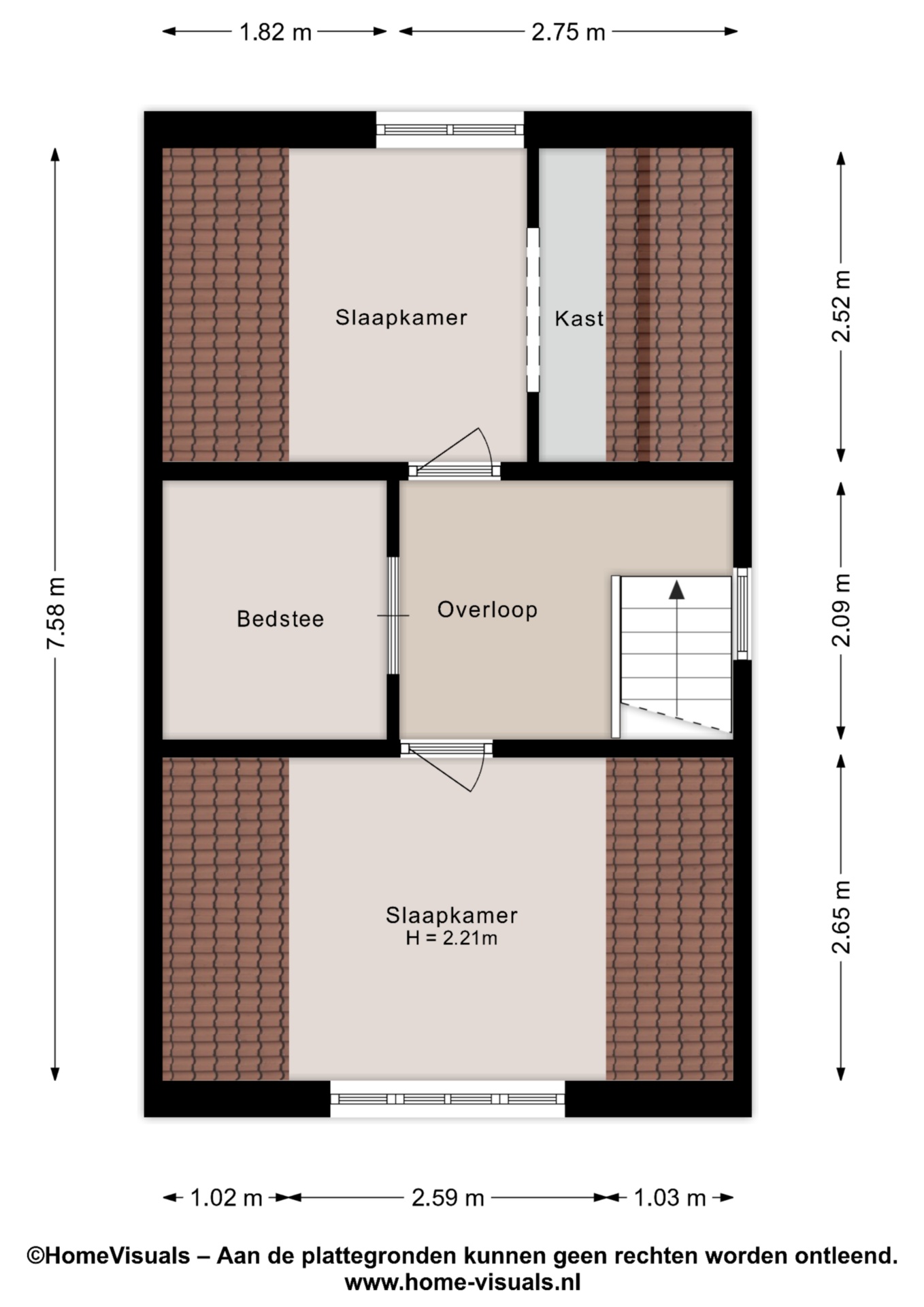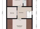Op de ruime overloop is een bedstee met een ruim bed (2.00 x 1.80) en er boven is een grote bergruimte, Aan de voor- en achterzijde bevinden zich de overige 2 slaapkamers. De kamer aan de achterzijde is voorzien van een rolluik.