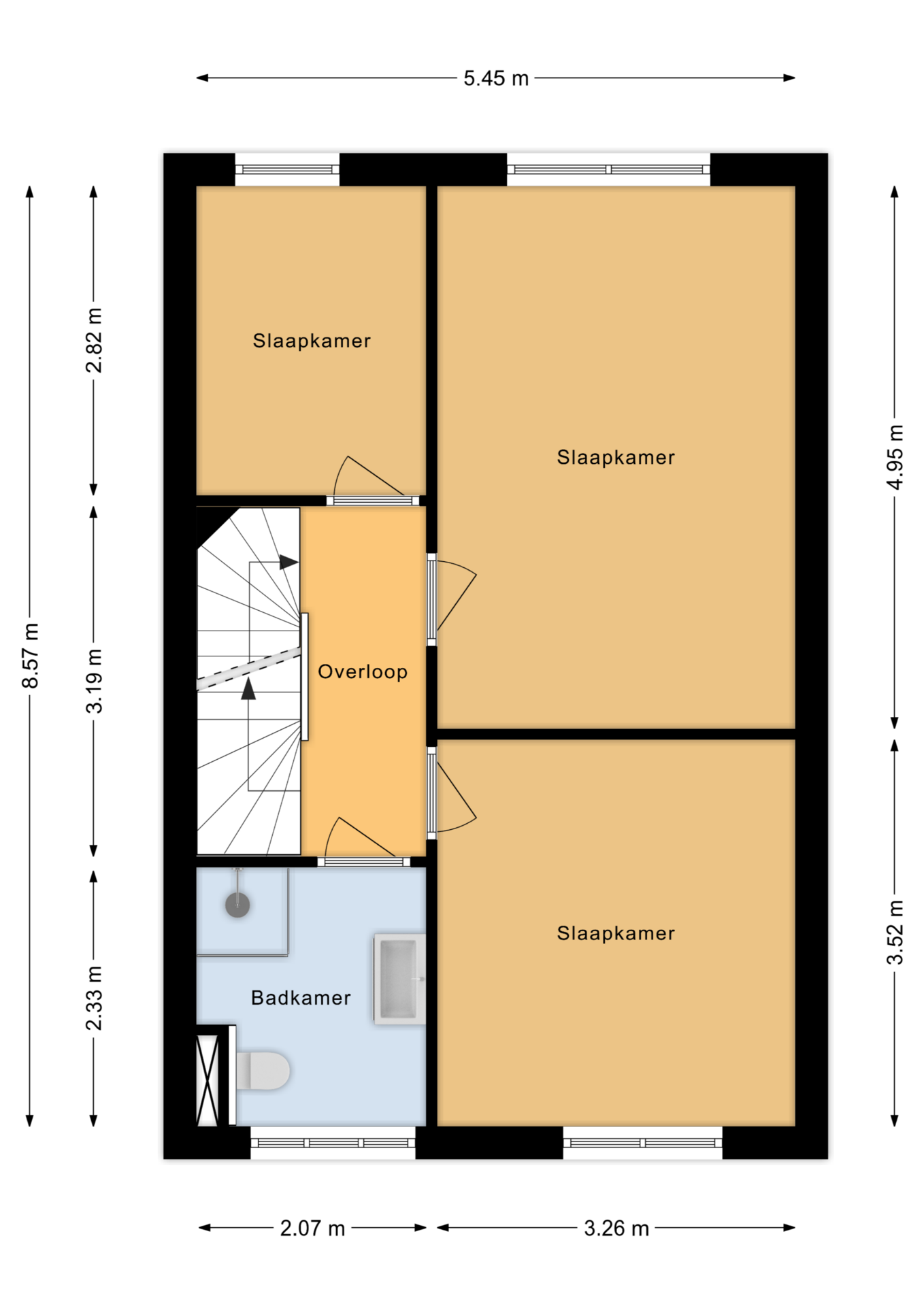 Drie fijne slaapkamers en een moderne badkamer met douche, wastafelmeubel en tweede toilet. Ook op deze verdieping is vloerverwarming aanwezig; luxe én praktisch.