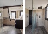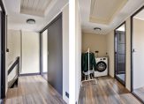 Overloop met wasmachineaansluiting, twee slaapkamers en een moderne badkamer (2021) voorzien van inloopdouche en wastafelmeubel.