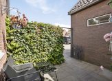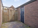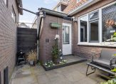 Achter de woning ligt een onderhoudsarme, geheel betegelde achterplaats met achterom. Ideaal voor een compacte loungehoek of een plek voor je fietsen. De vrijstaande stenen berging van circa 8 m² bevindt zich iets verderop in de straat.
