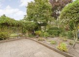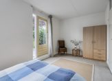 De achtertuin is verzorgd aangelegd met een combinatie van bestrating en groen. Bij de schuifpui zit je heerlijk beschut onder de overkapping. Daarnaast zijn er een houtopslag en een achterom aanwezig.