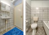 Overloop met daglicht en drie slaapkamers, waarvan één met toegang tot het platte dak. De badkamer is eenvoudig maar praktisch ingedeeld met ligbad, wastafel en toilet.