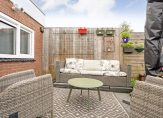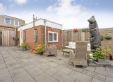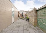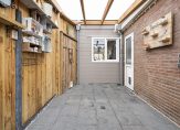 De zonnige achtertuin biedt veel privacy en beschikt over een multifunctionele ruimte met eigen toilet, vloerverwarming en wateraansluiting — ideaal als gastenverblijf, praktijkruimte of kantoor.