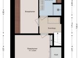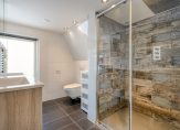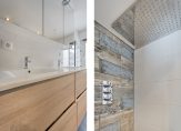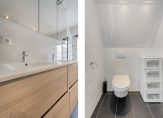 Overloop met toegang tot twee slaapkamers en de nette badkamer. De badkamer is ingericht met een douche, dubbele wastafel en toilet.
