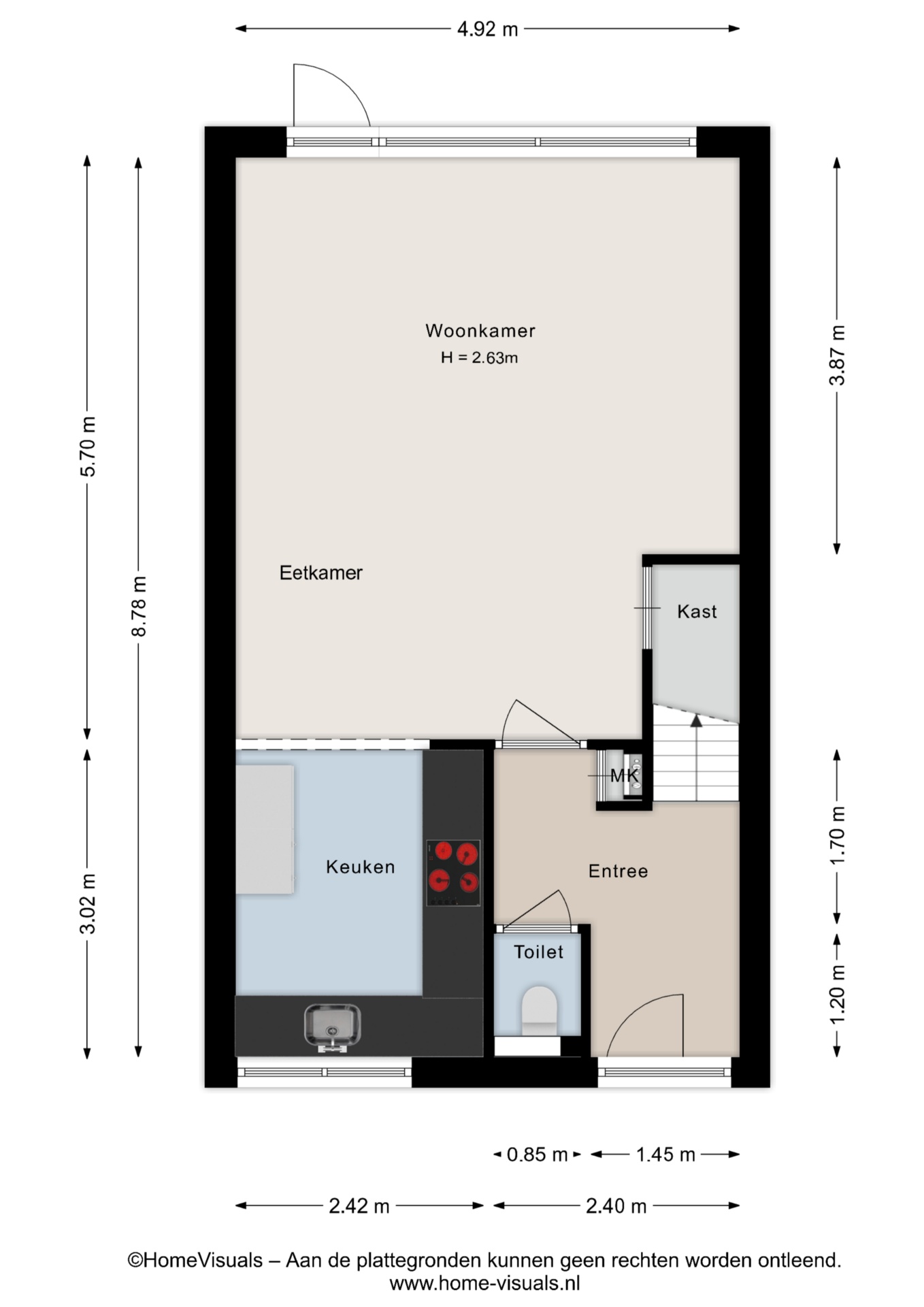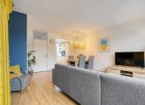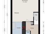 Je komt binnen in de hal met toilet en trapopgang. Vanuit hier stap je de lichte woonkamer binnen, met prettige afmetingen en een fijn zicht op de achtertuin. De grote raampartijen zorgen voor veel daglicht en maken dit een comfortabele leefruimte waar je graag verblijft.