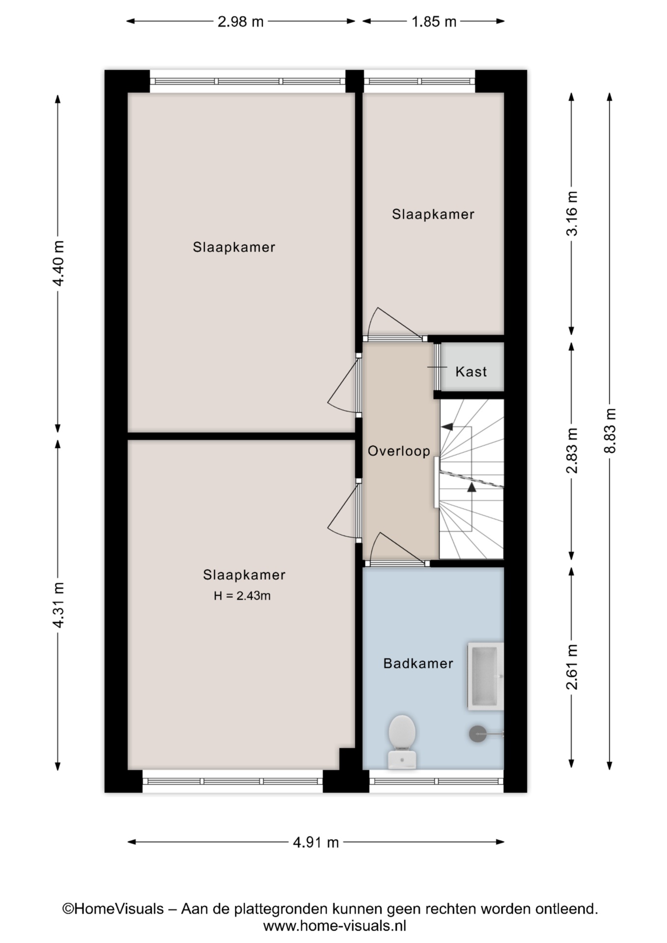Op de eerste verdieping zijn drie royale slaapkamers (ca. 6, 13 en 13 m²) en een nette badkamer met douchehoek, tweede toilet en vaste wastafel. Alles is netjes afgewerkt, dus je kunt er zó in.