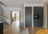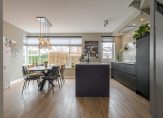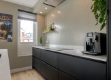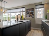 Vanuit de hal kom je in de ruime en lichte keuken. De moderne keuken is voorzien van een spoeleiland en onder andere uitgerust met een Quooker Cube voor kokend, gekoeld en bruisend water. Tussen de keuken en de woonkamer bevindt zich de trapopgang naar de verdiepingen, wat zorgt voor een prettige en logische indeling. De keuken sluit mooi aan op de woonkamer en staat via openslaande deuren in verbinding met de tuin. Samen vormen deze ruimtes een comfortabele leefomgeving waar koken, eten en ontspannen samenkomen.