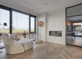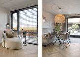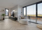 Zodra je binnenstapt, valt de prachtige visgraatvloer direct op. Via de stalen glazen deur kijk je door de woning heen en trekt het vrije uitzicht over de weilanden meteen je aandacht. Die zichtlijn geeft rust, ruimte en een gevoel van privacy dat je elke dag opnieuw waardeert.