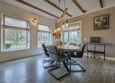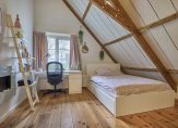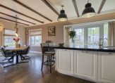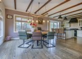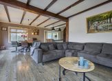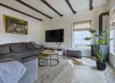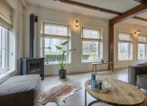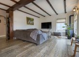 De woonkamer ligt aan de voorzijde van de woning en is een heerlijke plek om tot rust te komen. Dankzij de grote ramen geniet je hier van een vrij en weids uitzicht over de uitgestrekte landerijen, een uitzicht dat nooit verveelt en elk seizoen opnieuw verrast. De houtkachel zorgt voor extra warmte en sfeer, terwijl de zichtbare houten balken het karakter en de authenticiteit van de woning prachtig benadrukken.