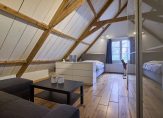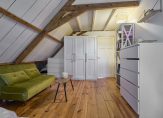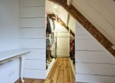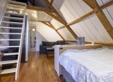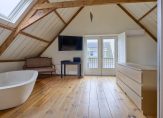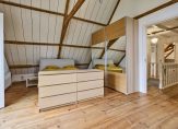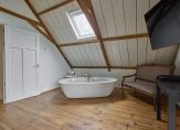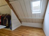 Op de eerste verdieping zijn drie slaapkamers te vinden, waarvan één echte eyecatcher: een slaapkamer met ligbad en openslaande deuren naar een Frans balkon. Verder is er een ruime badkamer met dakkapel, voorzien van vloerverwarming, een wastafelmeubel met dubbele wastafel, toilet en inloopdouche. Ook vind je hier nog een aparte kamer met inloopkast. De zolder is bereikbaar via een vaste trap in één van de overige slaapkamers en biedt extra bergruimte.