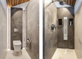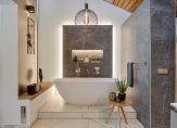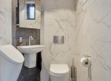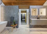 Ruime overloop met toegang tot een stijlvolle master bedroom met ingebouwde TV-kast, pvc-vloer en luxe badkamer en suite met Sunshower, inloopdouche, ligbad, Geberit douchetoilet en dubbele wastafel.