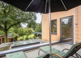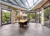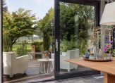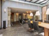 De aangrenzende eetkamer beschikt over openslaande deuren naar het overdekte terras met open haard, en een fraaie natuurstenen vloer, een heerlijke plek om het hele jaar door van binnen én buiten te genieten.