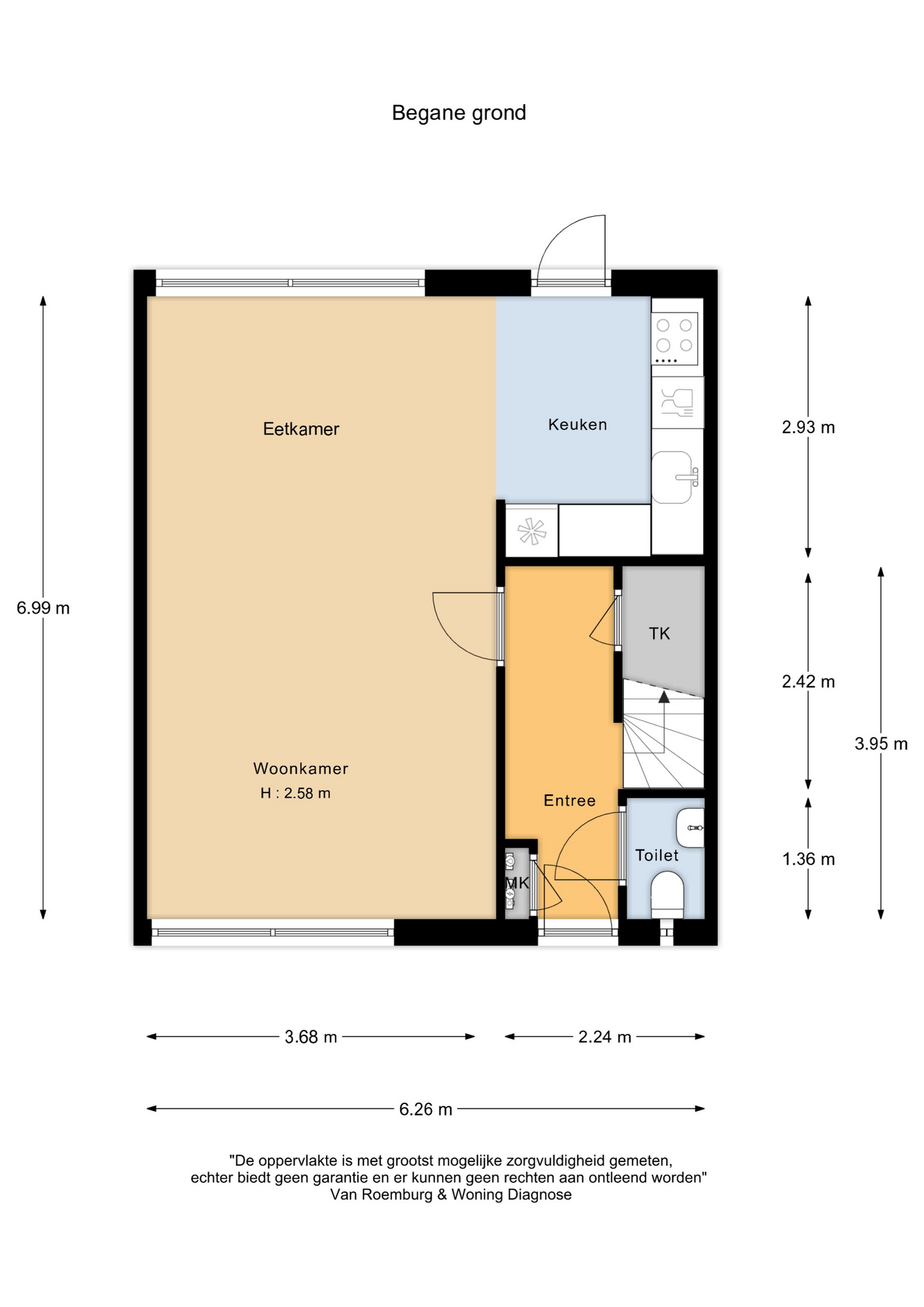 De woning is uit 1970 en beschikt over een entree/hal, meterkast, modern toilet met fontein en trapkast, lichte woonkamer met een moderne vernieuwde hoekkeuken met inbouwapparatuur (vaatwasser, quoteer, losse koel-vriescombinatie, oven en een inductiekookplaat). De gezellige woonkamer heeft een pvc vloer en vloerverwarming.