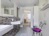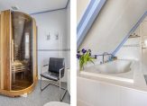 Overloop met bergkast, twee ruime slaapkamers van ca. 11 en 11 m² en een badkamer met ligbad, douchecabine, wastafel, toilet en sauna.