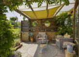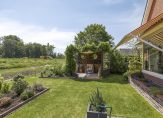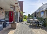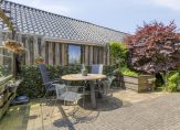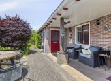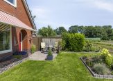 Bij de zij-entree is royaal terras en overkapping waar je heerlijk beschut kunt zitten. Aan de voorzijde is een ruime tuin met terras en overkapping op het zuidoosten waar je de hele dag kunt genieten van de zon en het vrije uitzicht over het weiland. De tuin is extra vergroot, daar er onlangs grond erbij is gekregen. Op de eigen oprit kunnen met gemak 3 auto’s staan. Naast de garage en huis is er ruimte voor opslag van hout en/of tuinspullen.