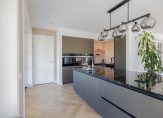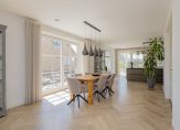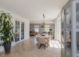 The open kitchen, with its spacious island, is a real eye-catcher and equipped with high-end Miele appliances. In addition to a BORA cooktop with integrated extraction and plasma filter, the kitchen features a steam oven, oven, combination microwave, two warming drawers, a wine climate cabinet, and the newest Quooker with boiling, chilled, and sparkling water. Naturally, a fully integrated fridge-freezer and dishwasher are also included. Two sliding doors give direct access to the veranda, creating a seamless transition between indoors and outdoors.