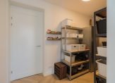 Aangrenzend bevindt zich een praktische bijkeuken met extra bergruimte en toegang tot de inpandige berging, waar tevens de waterontharder en de aansluiting voor de wasmachine zijn geplaatst, zodat je in de hele woning profiteert van zacht water. De volledige begane grond is voorzien van vloerverwarming én -koeling, inclusief de berging.