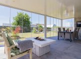 At the rear, a generous veranda with glass sliding walls awaits – the ideal spot to relax or enjoy long summer evenings. Even on cooler days, you can sit here sheltered and out of the wind; with just a little sunshine it’s pleasantly warm, and with a heater or fireplace you can make it even more comfortable. The TV connection makes this the perfect place for watching your favourite series or sports events.
