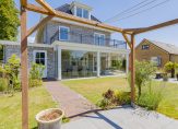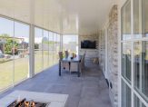 Achter de woning wacht een royale veranda met glazen schuifwanden – dé plek om te ontspannen of te genieten van lange zomeravonden. Ook op koelere dagen zit je hier beschut en uit de wind; al bij een beetje zon is het verrassend aangenaam, en met een heater of haard maak je het extra comfortabel. Dankzij de aanwezige televisieaansluiting is dit ook een heerlijke plek voor een avondje series of sport kijken.
