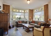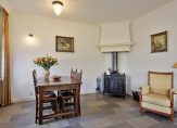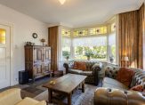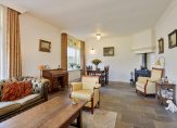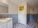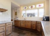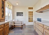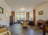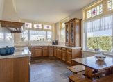 De woonkamer met sfeervolle houtkachel en erker aan de voorzijde is licht en heeft zicht op de tuin. Extra mooi detail zijn de glas-in loodramen, die we terugvinden in de entreehal, woonkamer en keuken. De keuken is ruim en landelijk en voorzien van alle gemakken. Daarnaast is er een bijkeuken en is er toegang tot de grote garage/schuur en de kelder.
