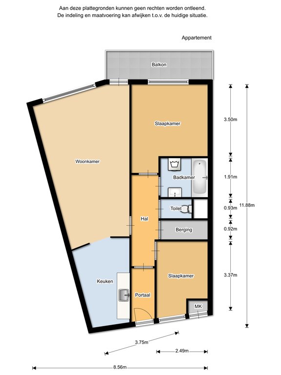 De voordeur geeft toegang tot de ruime hal en zijn een 2-tal ruim bemeten slaapkamers, de badkamer met wastafel in meubel en ligbad met douchewand, was-/bergruimte en het separate toilet bereikbaar. Vanuit de hal is de entree naar de woonkamer en geeft een deur toegang tot het ruime en zonnige terras. De half open keuken bevindt zich aan de voorzijde.