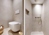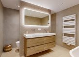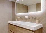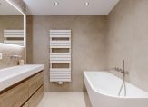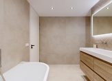 – Badkamer met ligbad, toilet, douche, dubbele wastafel, wastafel, wastafelmeubel en inloopdouche