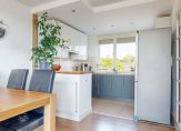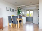 Indeling woning: ruime hal met meterkast, trapkast en modern toilet. De hal geeft tevens toegang tot de ruime en lichte woonkamer met deur naar het terras. De half open keuken bevindt zich aan de voorzijde en is de keukeninrichting voorzien van koelkast, vaatwasser, keramische kookplaat, oven en afzuigkap.