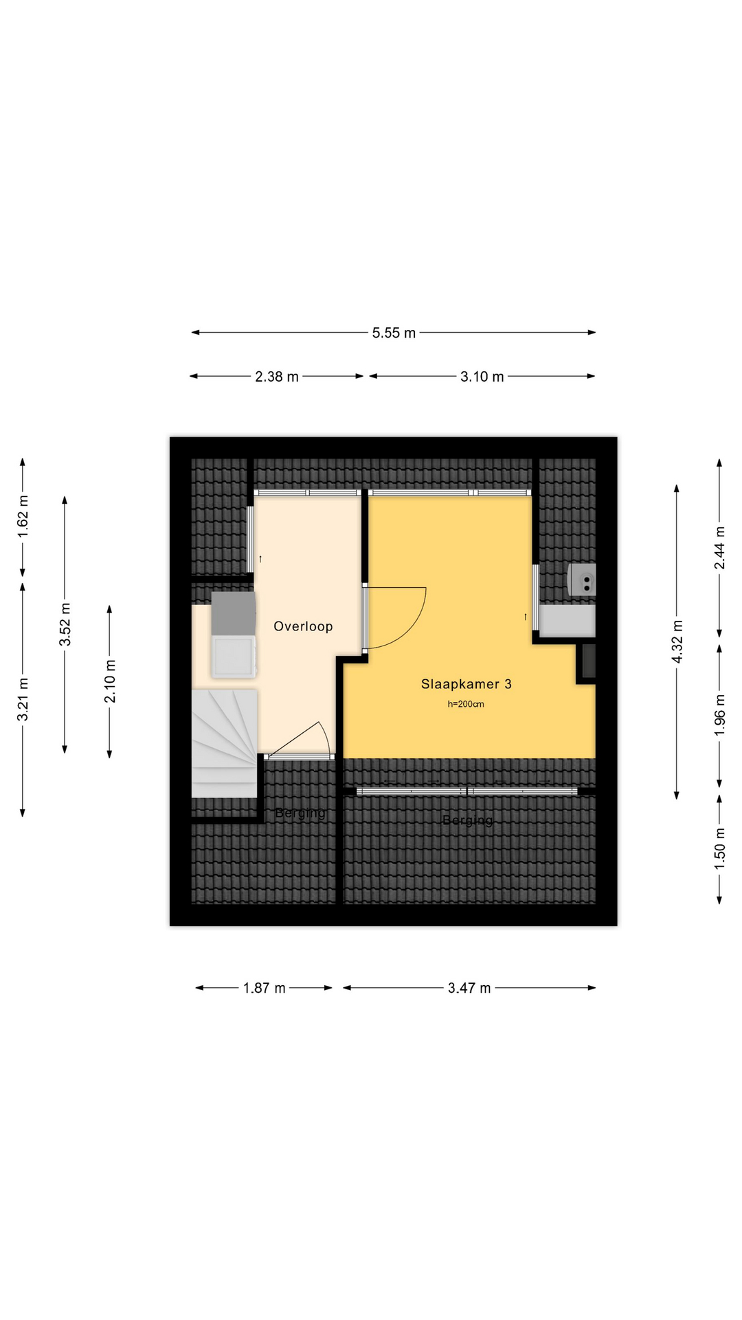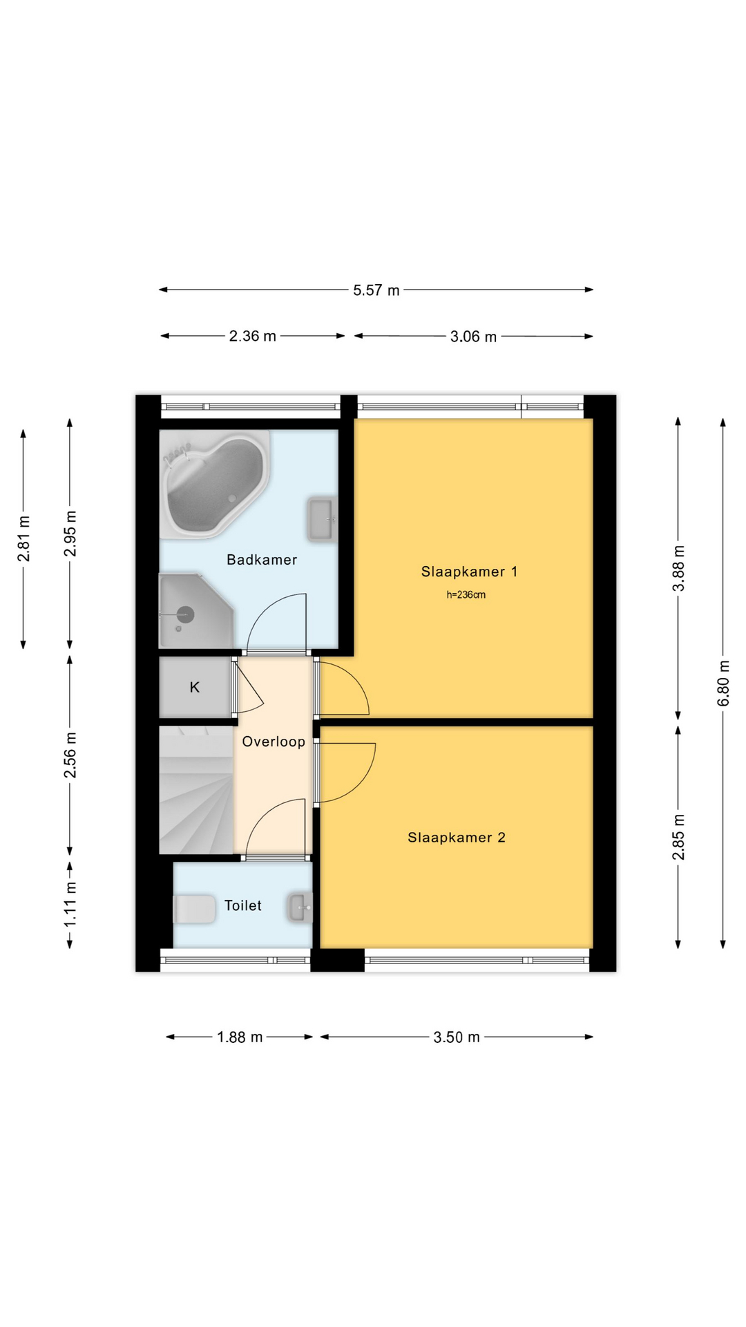 Via de trapopgang kom je op de overloop met toegang tot twee slaapkamers, de badkamer, een bergkast en het separate toilet.