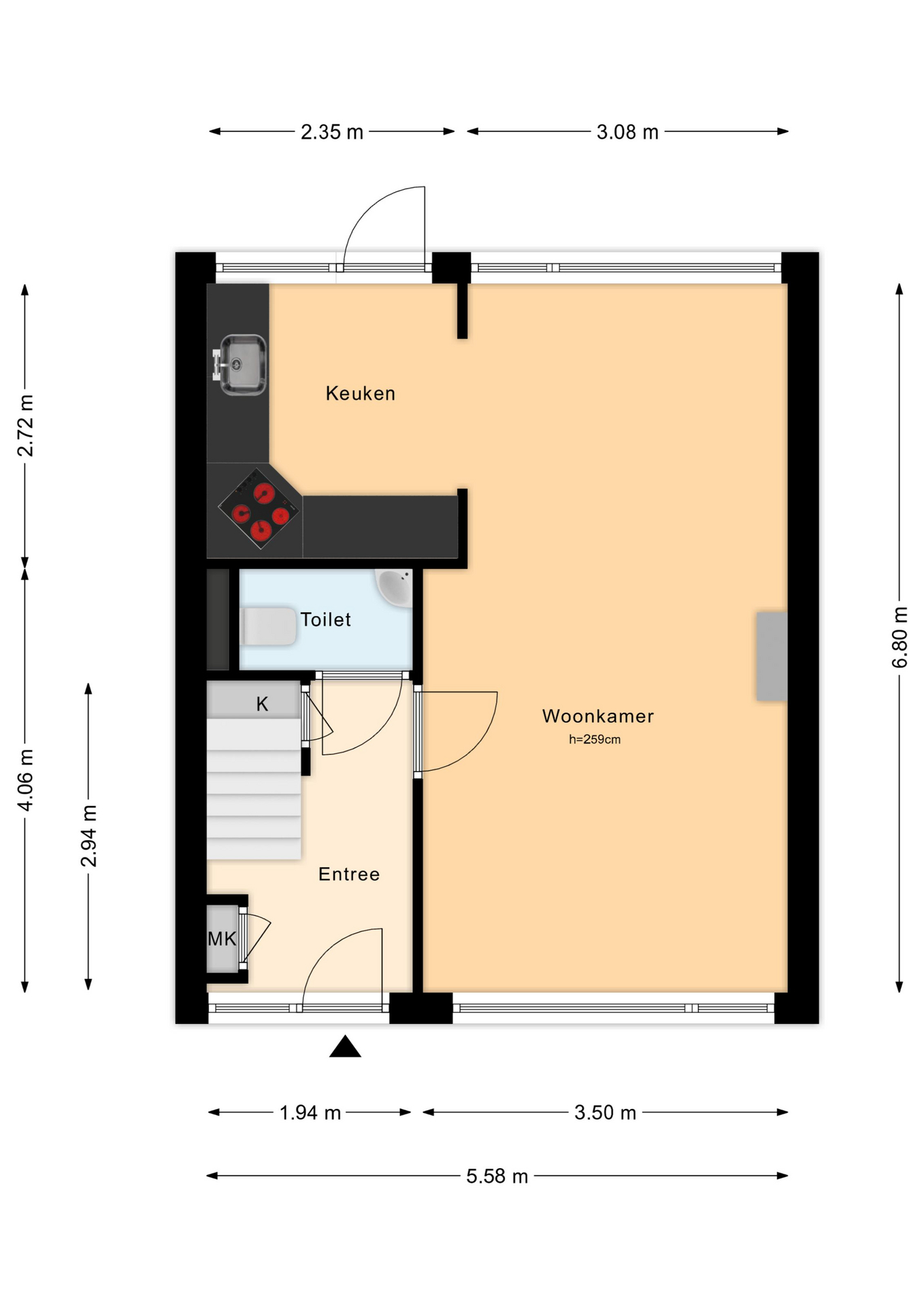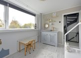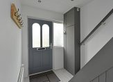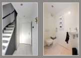 De entree geeft toegang tot de hal met meterkast, trapopgang, provisiekast, toiletruimte met hangend toilet en fonteintje, en de doorgang naar de woonkamer.