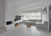 De woonkamer is heerlijk licht dankzij de grote raampartijen aan zowel de voor- als achterzijde. In het midden van de kamer zorgt de sfeervolle haard voor een warme en huiselijke uitstraling.