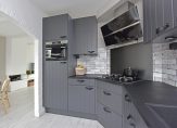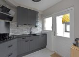 Aan de achterzijde bevindt zich de keuken, die in 2019 volledig is gerenoveerd. De hoekopstelling is voorzien van diverse inbouwapparatuur, waaronder een vaatwasser, gaskookplaat, koelkast, combi-magnetron en afzuigkap. Vanuit de keuken stap je direct de tuin in.