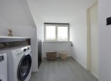 De tweede verdieping is bereikbaar via een vaste trap. Hier kom je op de overloop met twee grote bergkasten en aansluitingen voor wasmachine en droger.