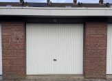 Garage gelegen in Nieuwkoop met stalen kanteldeur gelegen in een rij van garages aan een plein, voorzien van een plat dak met bitumen dakbedekking.