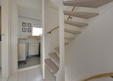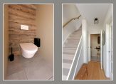 De badkamer, eveneens aan de achterzijde en vernieuwd in 2022, is voorzien van een ruime douche, zwevend toilet, handdoekradiator en een stijlvolle wastafel met betonnen wasbak, verwarmde spiegel en zwarte inbouwkranen. De voormalige badkamer aan de voorzijde dient nu als wasruimte voor wasmachine en droger. In de bergkast op de overloop bevindt zich de cv-ketel.