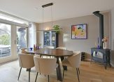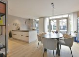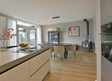 De keuken is in 2022 compleet vernieuwd en uitgerust met hoogwaardige apparatuur: een combi-oven met stoomfunctie, inductiekookplaat met afzuiging, koelkast, vriezer, vaatwasser, warmhoudlade/bordenwarmer en een Quooker met opties voor ijswater, bruisend water en kokend water. In de woonkeuken vind je ook een sfeervolle houtkachel. Zowel woonkamer als keuken hebben een prachtige houten vloer, en de wanden en plafonds zijn strak gestuukt. De grote pui zorgt voor veel lichtinval. Via de openslaande deuren én de loopdeur stap je zo de veranda en de tuin in.