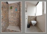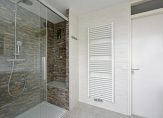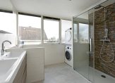 Royale badkamer met dakkapel, voorzien van een inloopdouche met thermostaatkraan en regendouche, tweede toilet, wastafelmeubel en aansluitingen voor een wasmachine en droger.