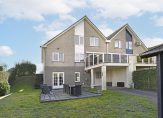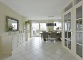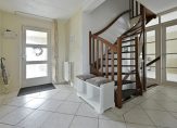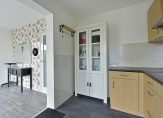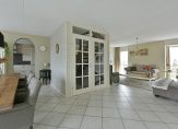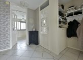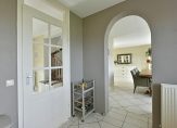 De hoofdentree bevindt zich aan de voorzijde van de woning, met een fraai vormgegeven overdekte entree. Hier komt u binnen in een ruime hal met garderobe, een toiletruimte met fontein en toegang tot de keuken.