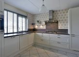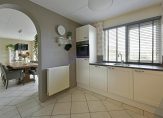 De moderne keuken, opgesteld in L-vorm, is voorzien van diverse inbouwapparatuur, waaronder een koel-/vriescombinatie, elektrische oven, 5-pits gaskookplaat, afzuigkap en vaatwasser.