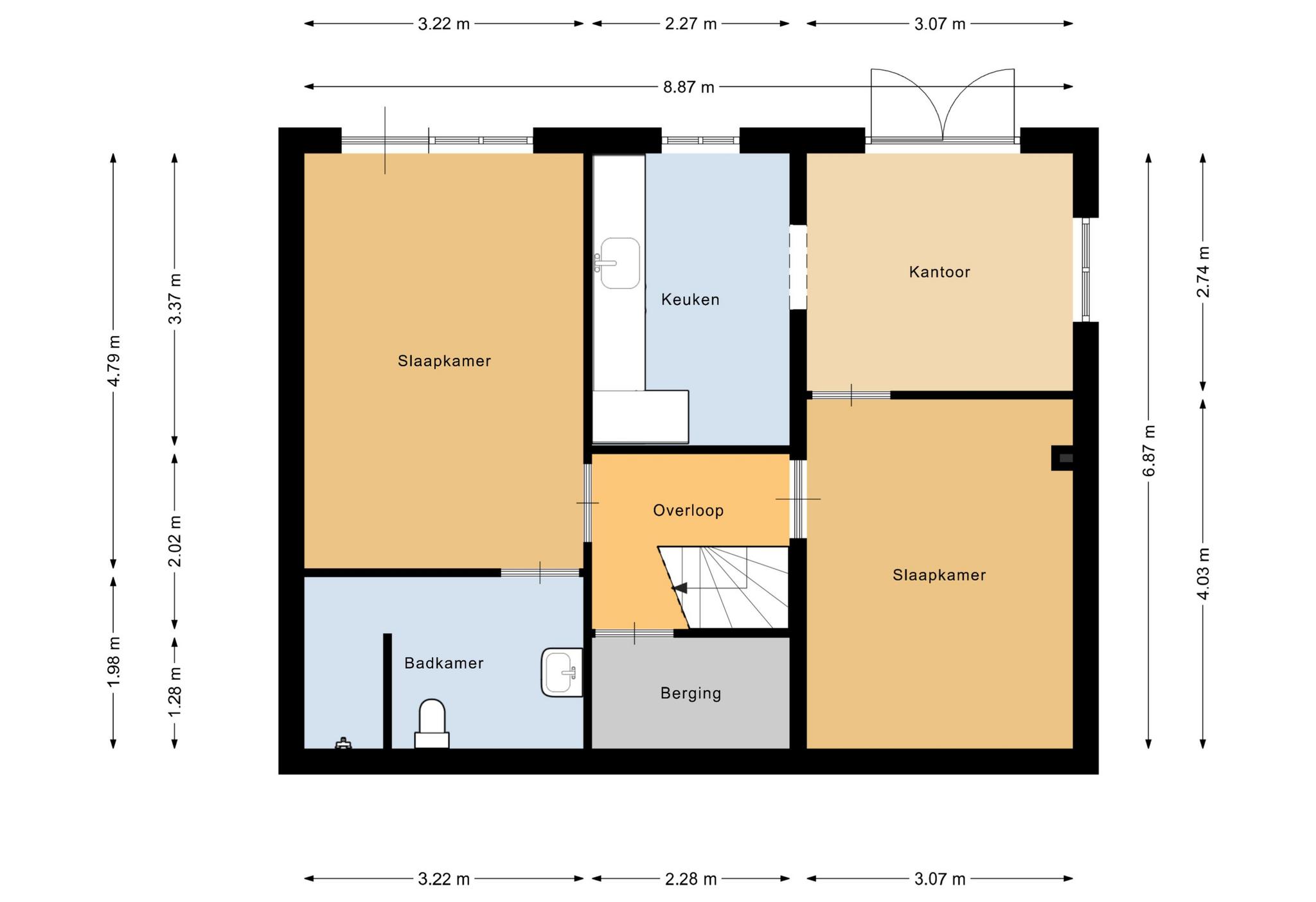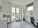 Tweede slaapkamer met toegang tot een kantoorruimte en een aparte keukenruimte met diverse inbouwapparatuur.