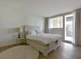 Ruime slaapkamer met eigen badkamer, voorzien van een inloopdouche, hangend toilet en wastafelmeubel. Via een loopdeur is er directe toegang tot de tuin.