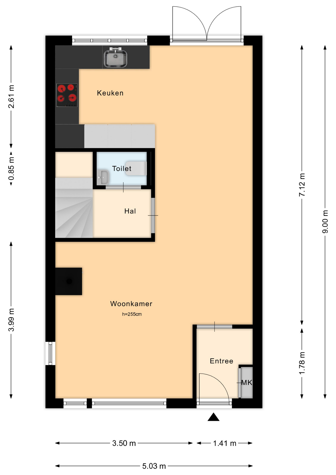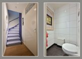 In het midden van de woning bevindt zich een tussenhal met een modern toilet (met hangend closet en fonteintje) en de trapopgang naar de eerste verdieping. Hier is tevens een tweede meterkast (2024) geplaatst.