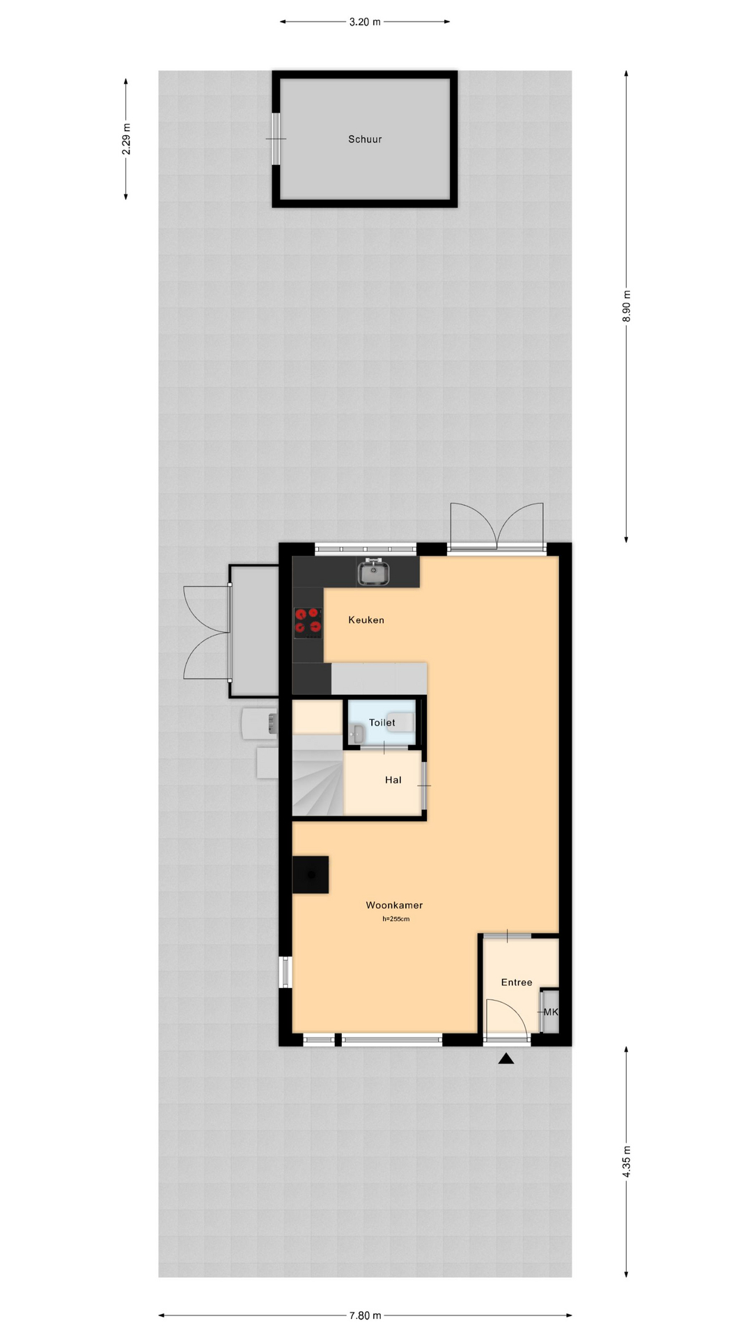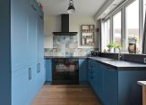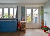 Aan de achterzijde ligt de open keuken, uitgerust met diverse inbouwapparatuur: afzuigkap, koelkast, vrieskast, vaatwasser, royale elektrische oven en een 5-pits inductiefornuis. Via twee fraaie openslaande deuren is de achtertuin bereikbaar.