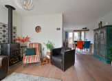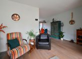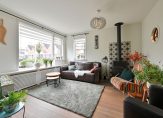 Via de overdekte entree kom je in de hal met vernieuwde meterkast, garderoberuimte en toegang tot de woonkamer. De straatgerichte woonkamer is voorzien van grote raampartijen en een zijraam, wat zorgt voor veel natuurlijk licht. Een sfeervolle houthaard creëert een warm thuisgevoel.