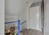 Vanaf het tussenportaal leidt de trap naar de overloop van de eerste verdieping. Hier bevindt zich toegang tot twee slaapkamers en de badkamer. Boven de overloop is een luik naar de warmtepomp (2024), bereikbaar middels een los neer te zetten trap.