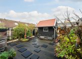 De voor-, zij- en achtertuin met zij-ingang zijn verzorgd aangelegd. Er is een grote vrijstaande stenen schuur aanwezig, bekleed met Zweeds rabat, én een tweede berging voor fietsen, direct bereikbaar via de tweede zij-ingang. De ruime achtertuin ligt op het noordoosten en beschikt over een gezellige overkapping met houtopslag.
