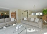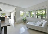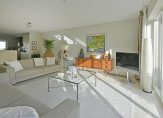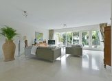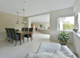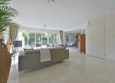 De woonkamer is heerlijk licht dankzij de grote raampartijen en openslaande deuren naar de tuin. De marmeren vloer mét vloerverwarming maakt het extra comfortabel.