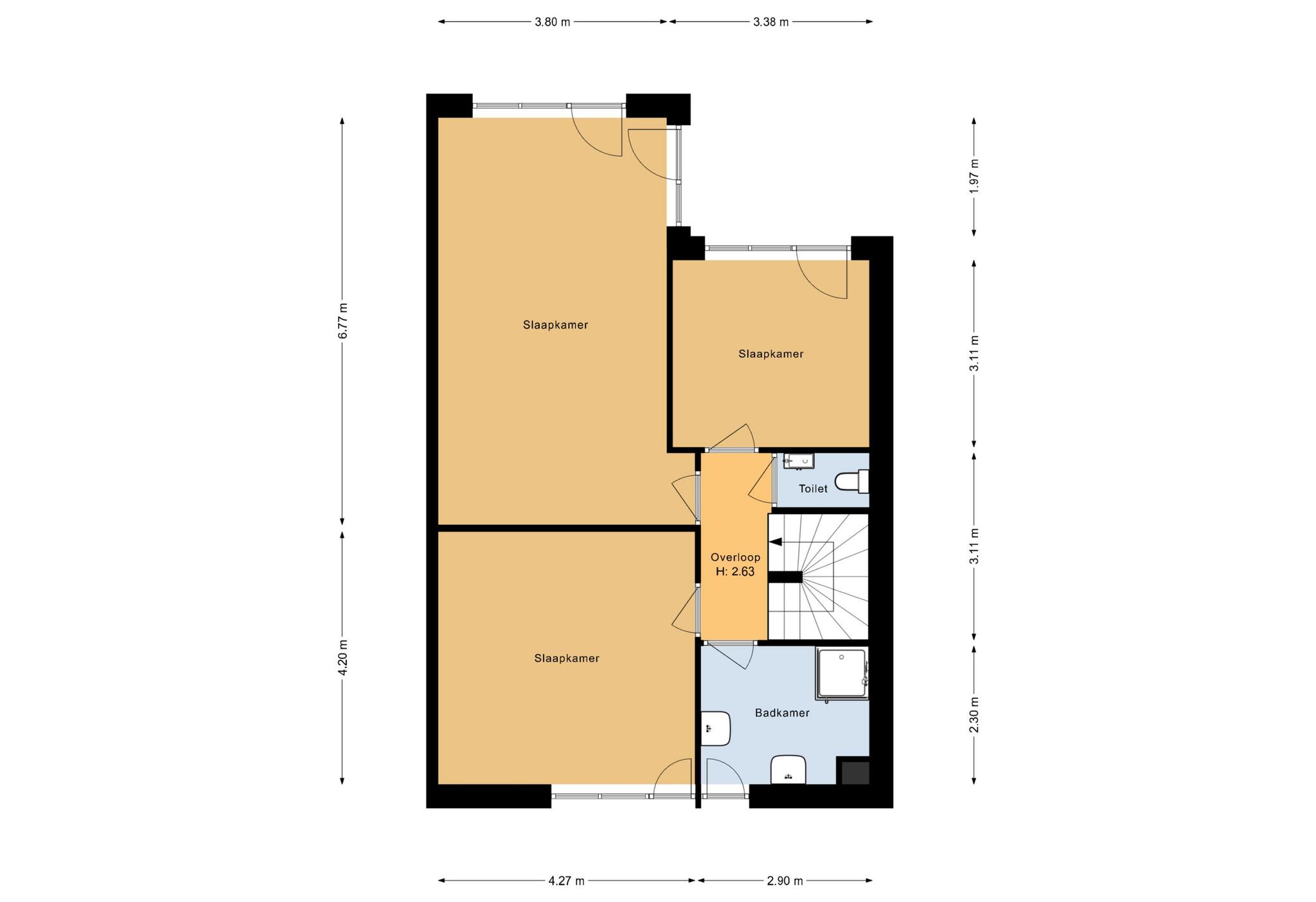 Via de vaste trap kom je op de ruime overloop, die toegang geeft tot drie ruime slaapkamers, een separaat toilet en de badkamer.