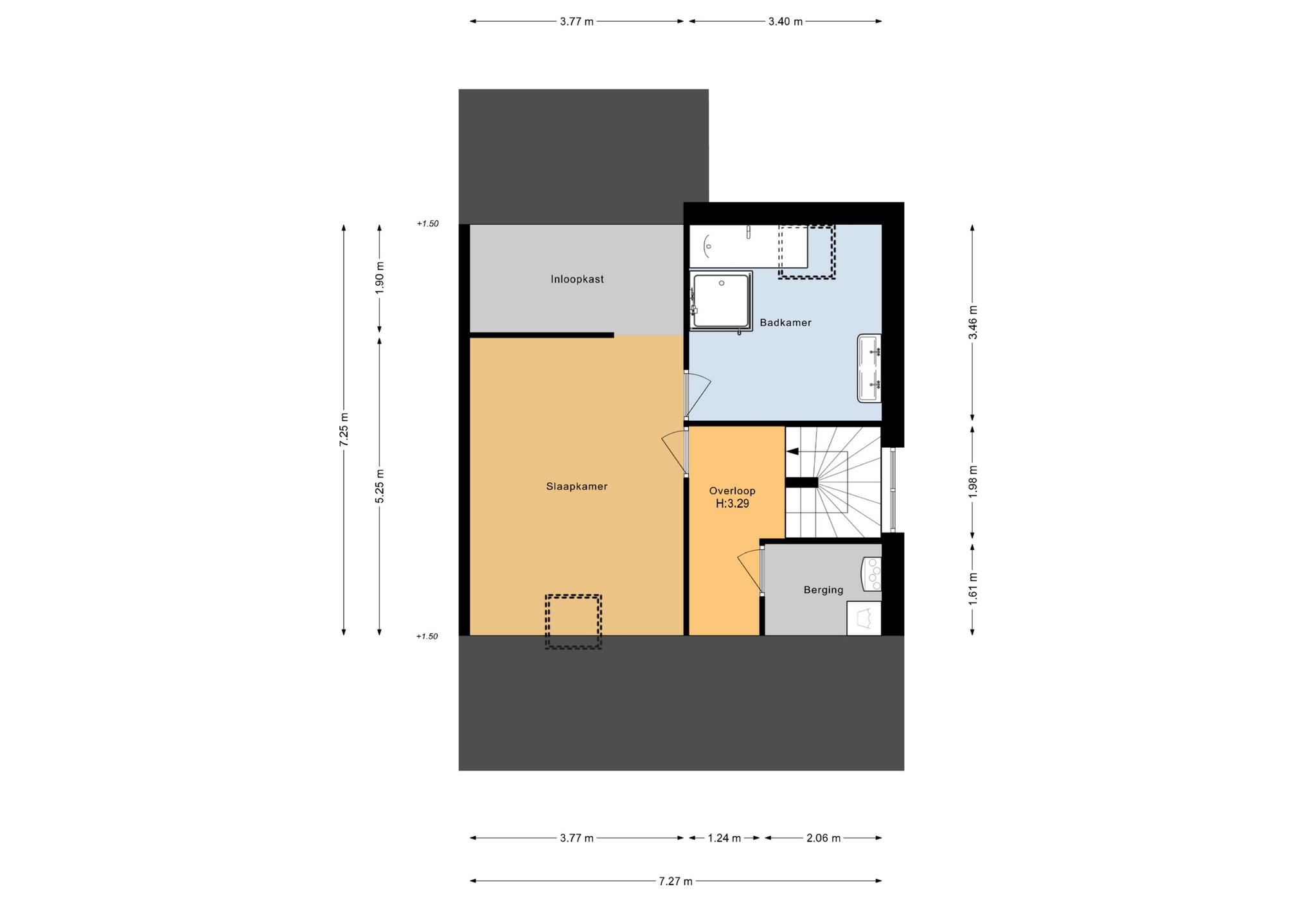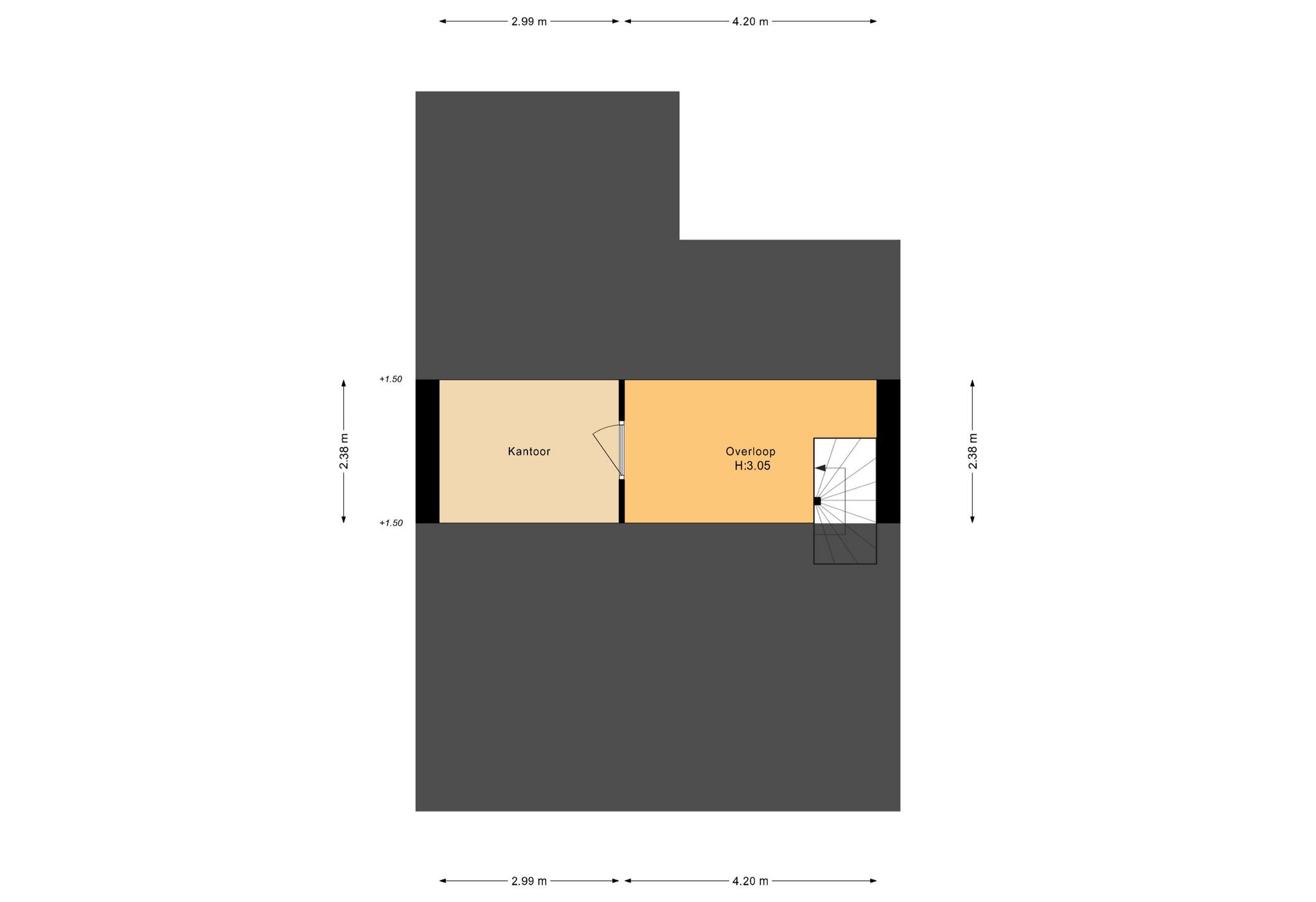 De tweede verdieping is bereikbaar via een vaste trap. Vanuit de overloop is er toegang naar de technische ruimte, de slaapkamer en de trapopgang naar de 3e verdieping.