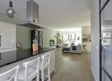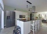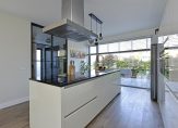 Aan de voorzijde bevindt zich de moderne woonkeuken met een kookeiland inclusief bar en een extra grote kastenwand. De keuken is voorzien van diverse inbouwapparatuur, waaronder een close-in boiler, inductiekookplaat, afzuigkap, stoomoven, combimagnetron en een Amerikaanse koelkast met vriezer (ter overname). Het grote raam zorgt voor veel natuurlijk licht.